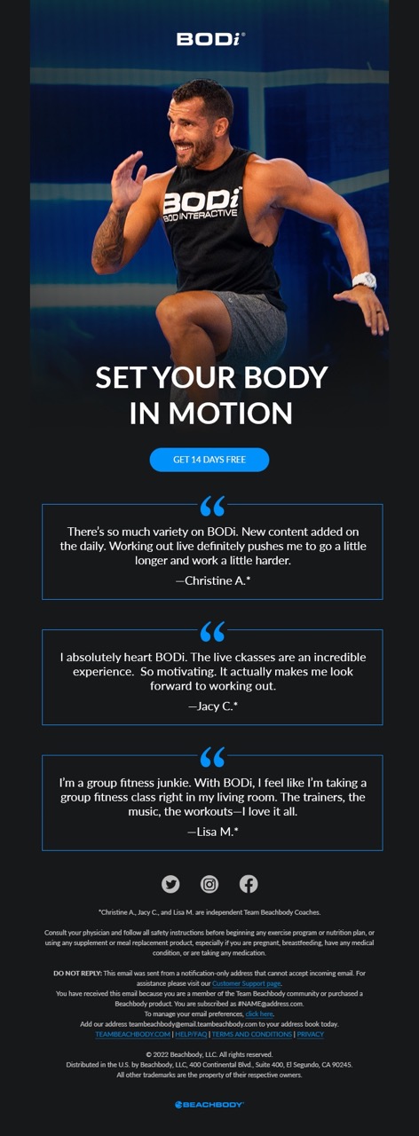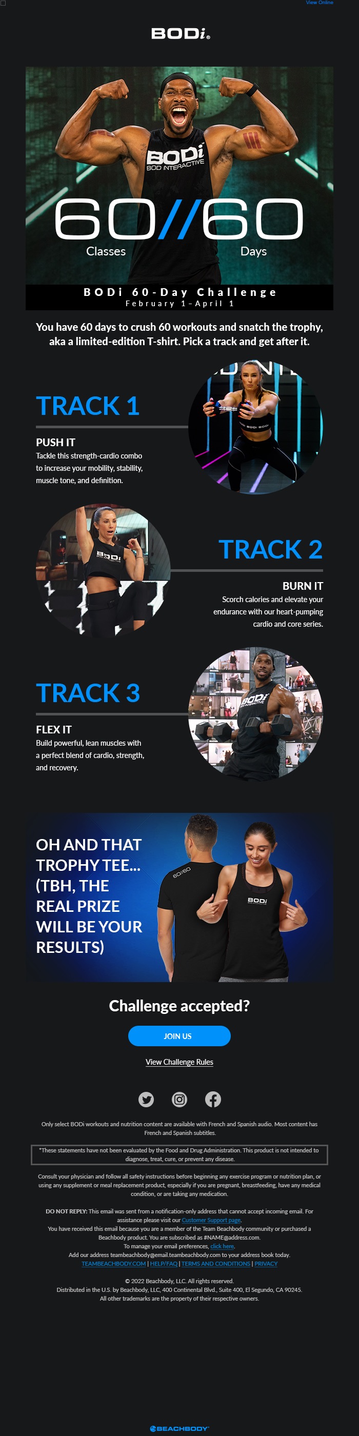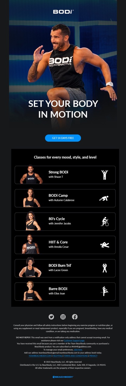 BODi is the live-class fitness platform within our house of brands. It offers challenging, energetic workouts that push your body to its limits. The personality is active, provocative, and straightforward. The audience tends to be intermediate to advanced.