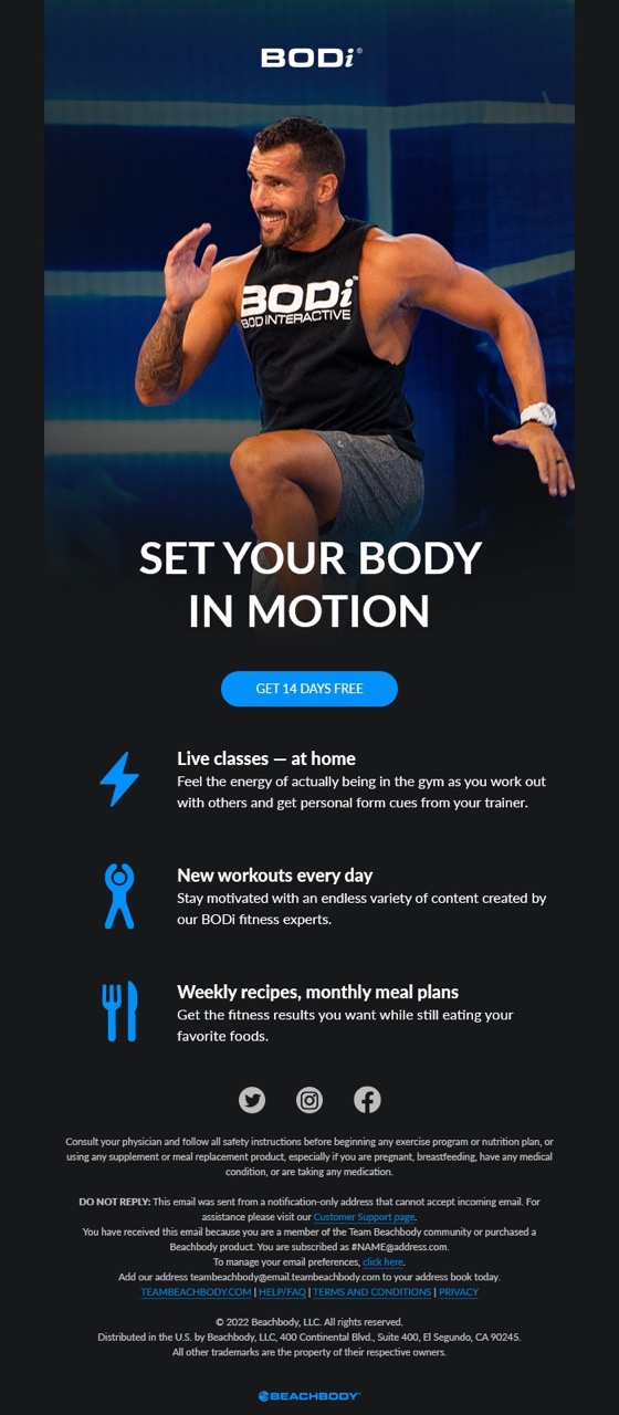 Through prior A/B testing, we landed on an email headline, "Set your body in motion," that embodied the spirit of the brand and performed well consistently. Now we needed to optimize the supporting copy. Ultimately, the benefit-driven Version A won. But Version B also showed legs, so we wove some of that messaging into future emails.