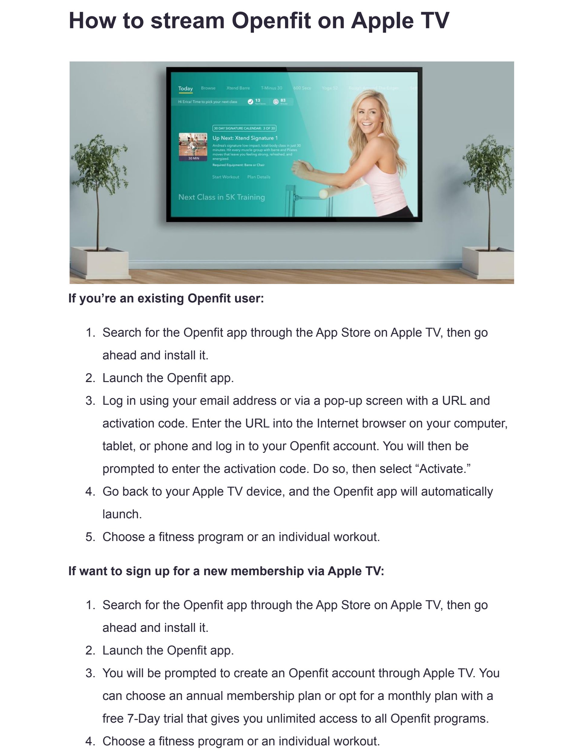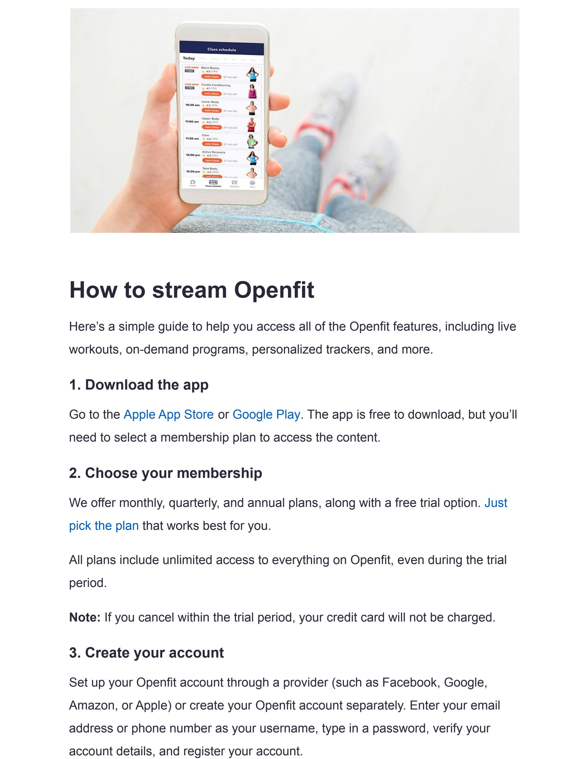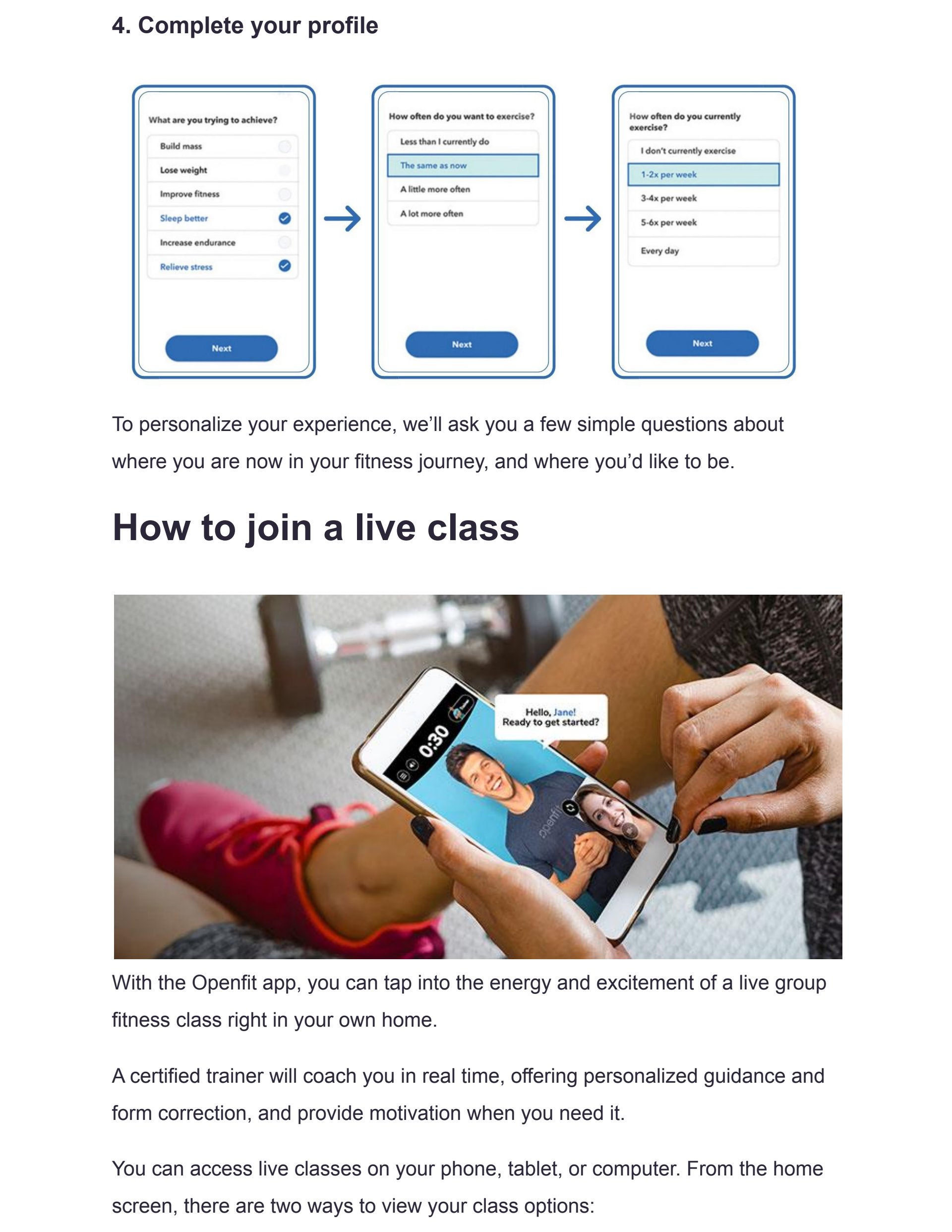 The Openfit tutorial was originally laced with playful language that mirrored the brand. But that caused this communication to run way too long. So we sacrificed some personality for brevity and clarity, reducing the scope down to just the "how to's."