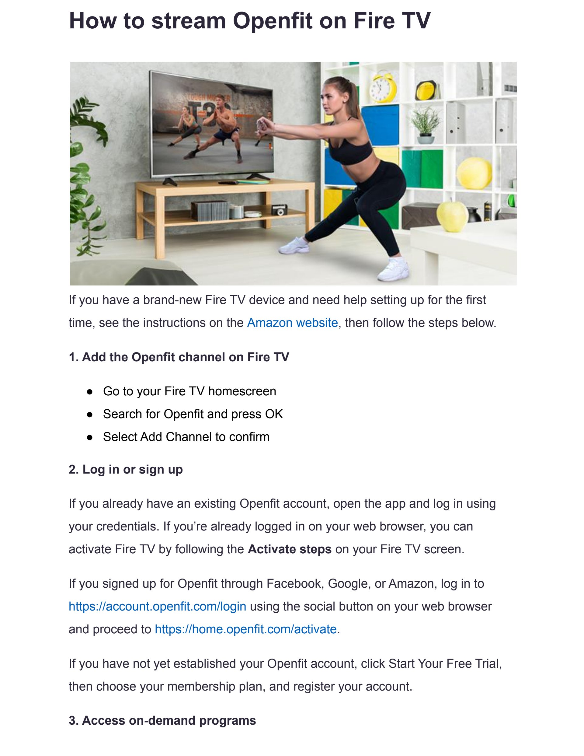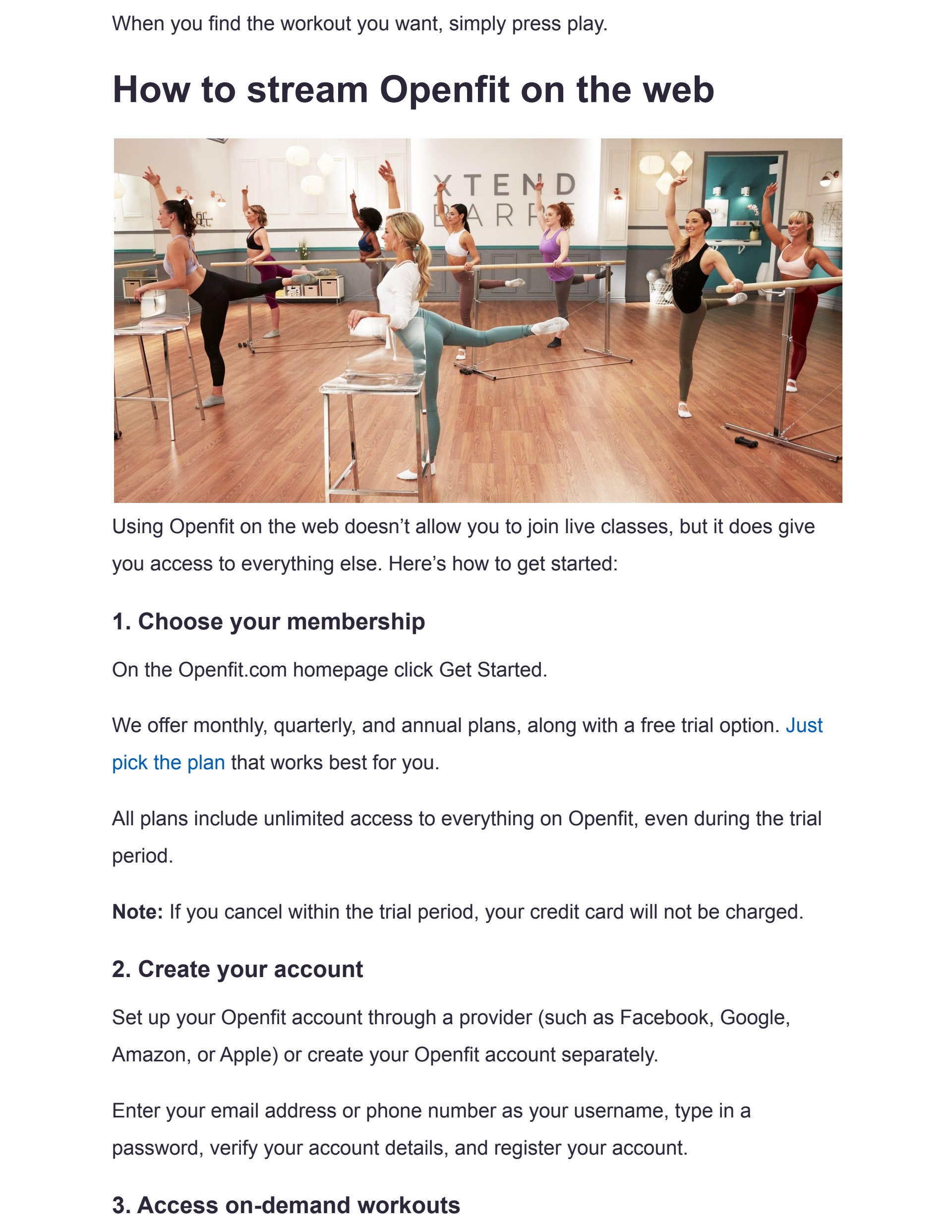 Openfit is an on-demand fitness platform within BODi’s house of brands, specializing in medium-intensity cardio classes; low-impact workouts like barre, Pilates, and yoga; and mindful meditations, led by experts who care. The brand's audience skews 80% female, ranging from beginner to advanced.