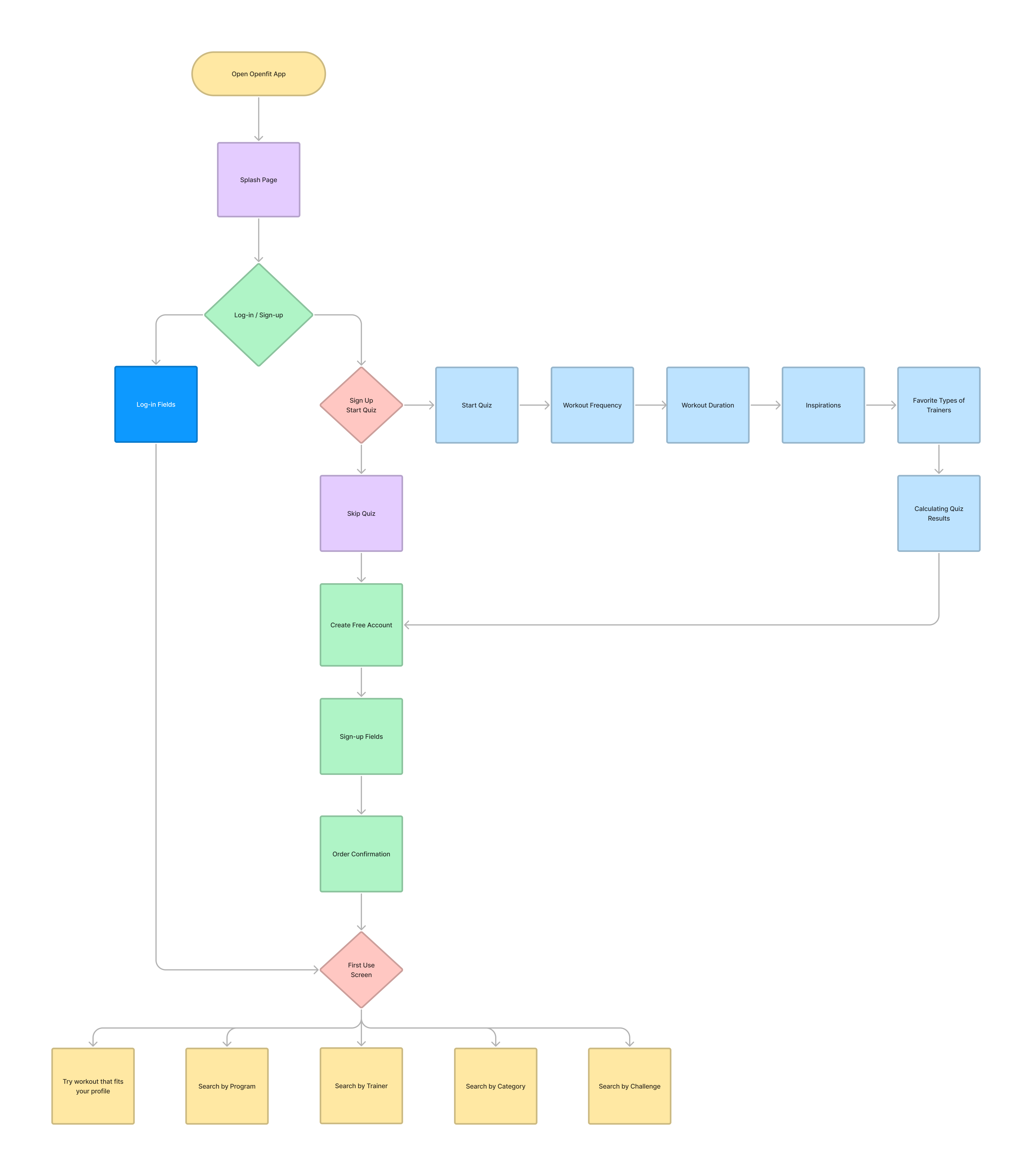 Initially, we thought offering a 14-day free trial membership would be enough to get people to at least create a free account. Nope. So we allocated a large chunk of our testing resources to the sign-up portion of the app experience. The following diagram illustrates the winning sign-up flow.